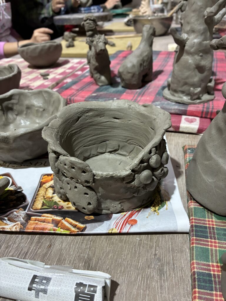 ななこ先生とドイツから研修に来られたユリア先生と一緒にサンタ・来年の干支の馬を制作しました。その後は自由に自分の好きな物やその時の一瞬の想いを土を還し、容にしていきました!