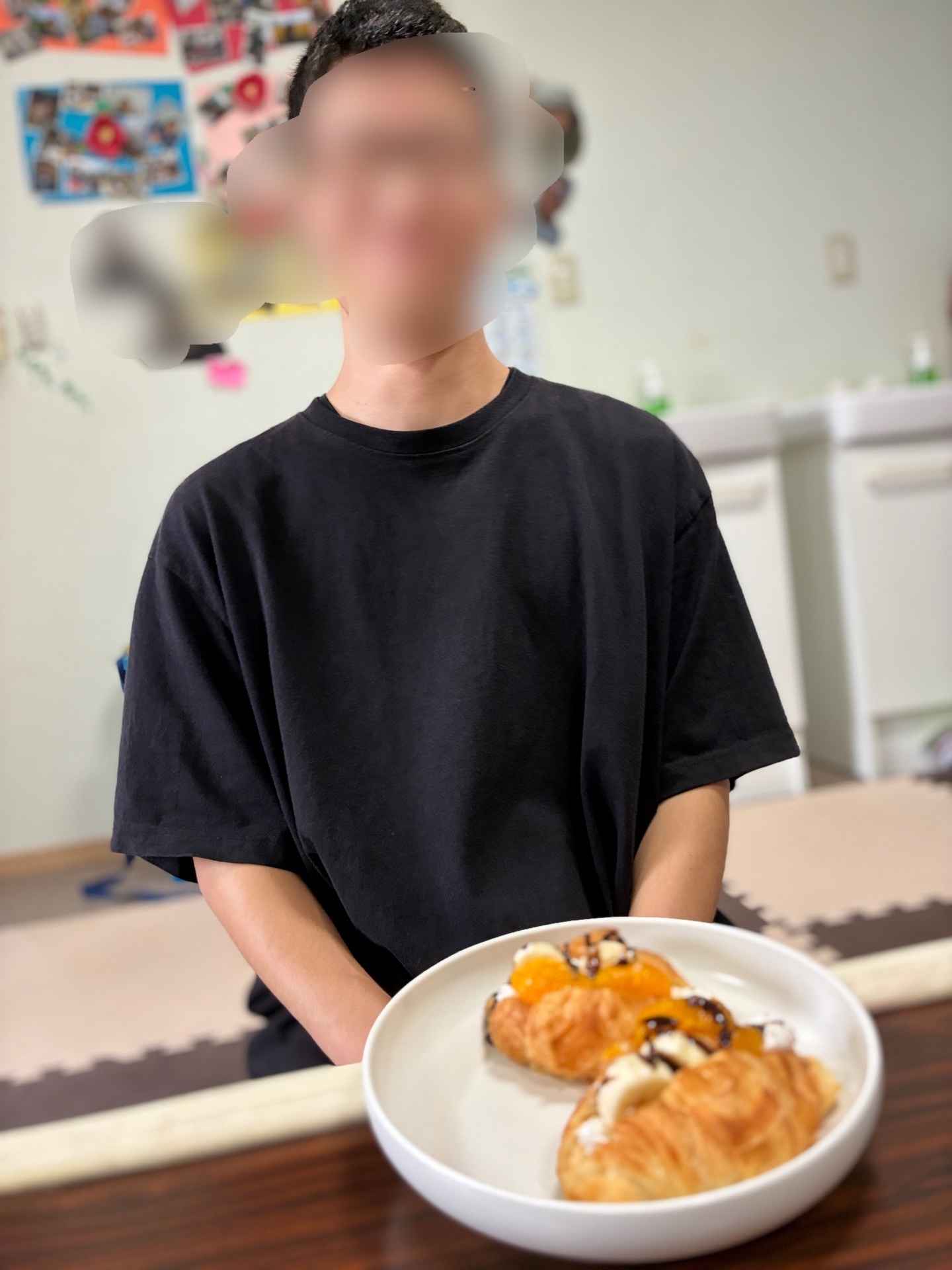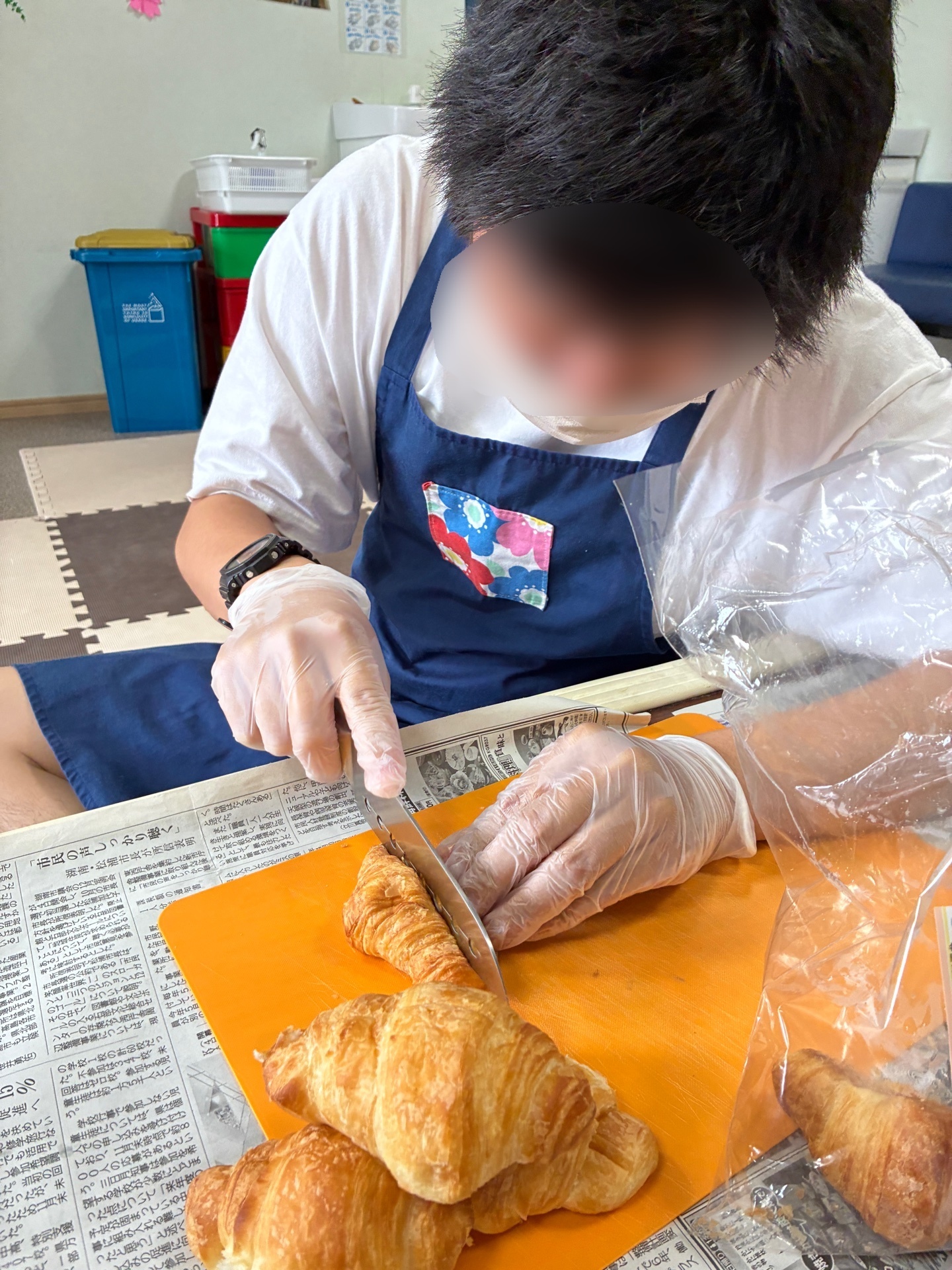 クロワッサンで挟むので切り込み作業を行ってくれてます。これまた、真っ二つに切らないよう、力加減が大切です。