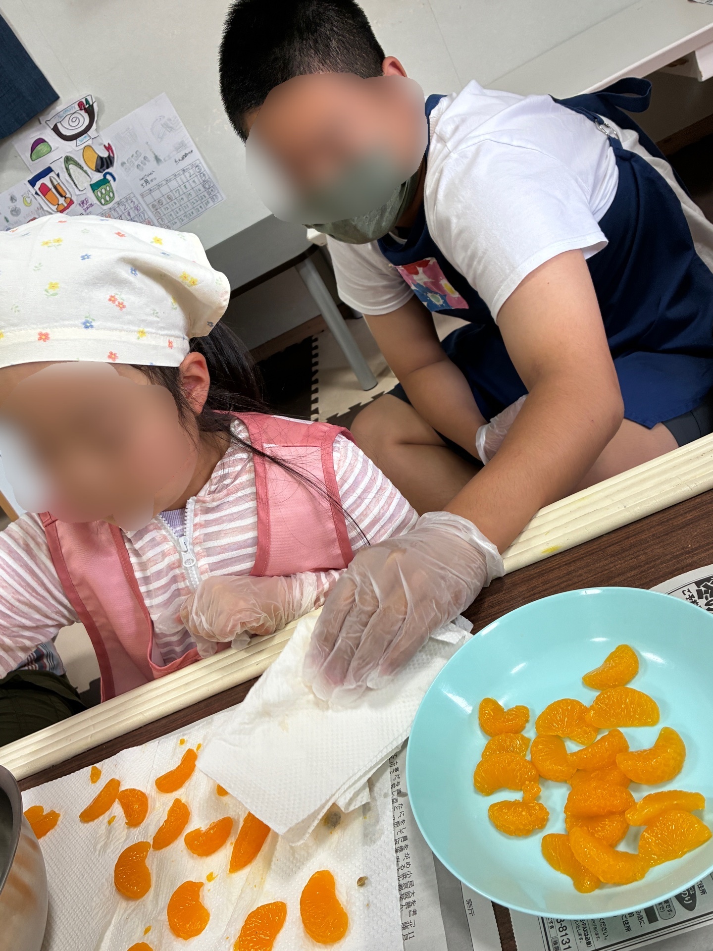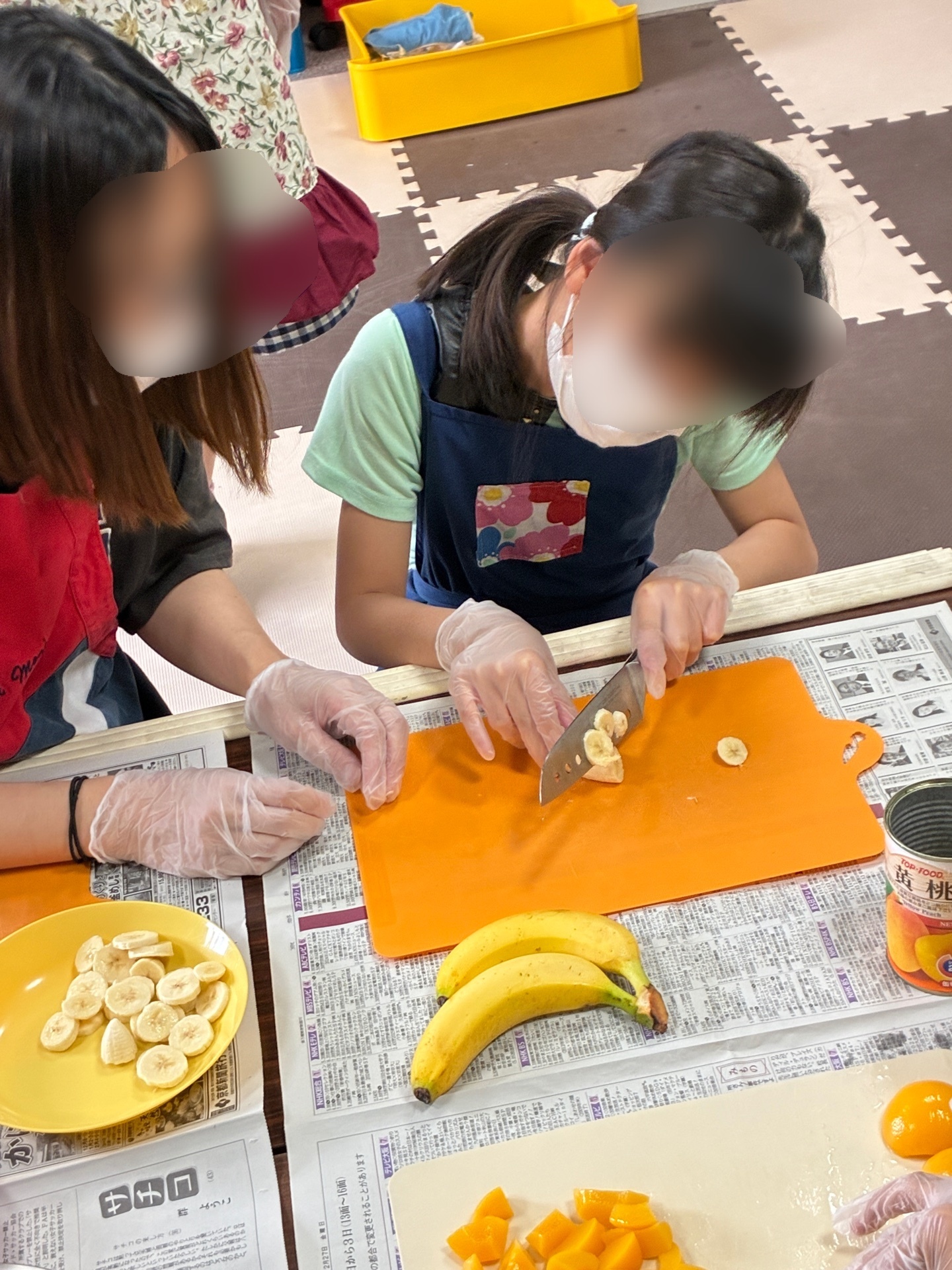 缶詰めから取り出されたフルーツをペーパーの上で優しく転がし、水気を取っています。力加減が大事ですね!