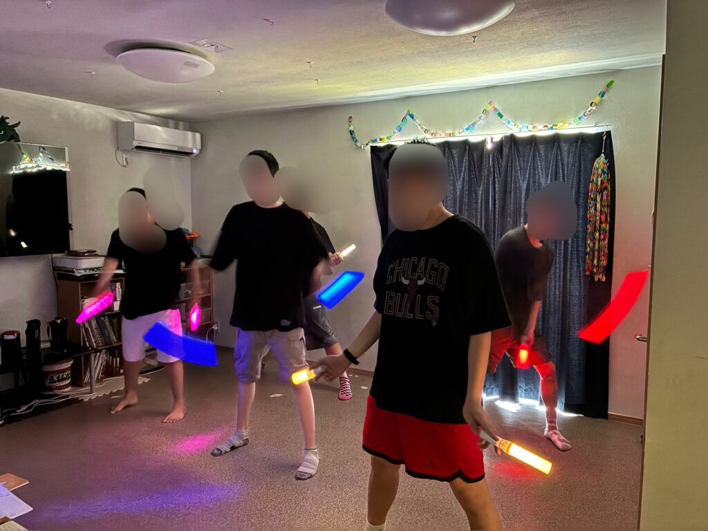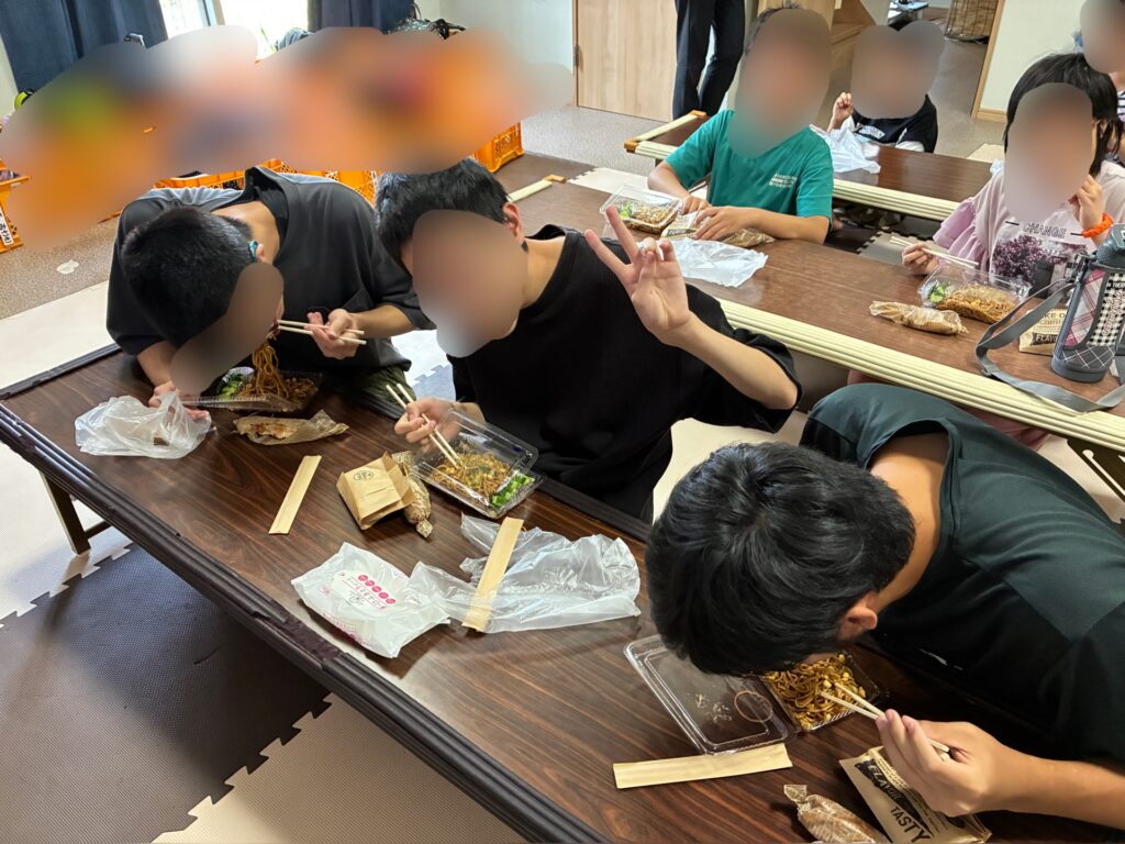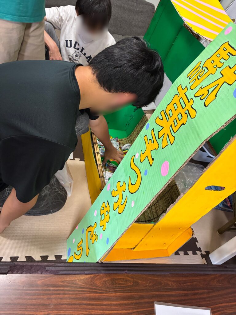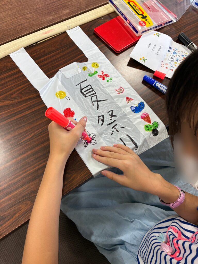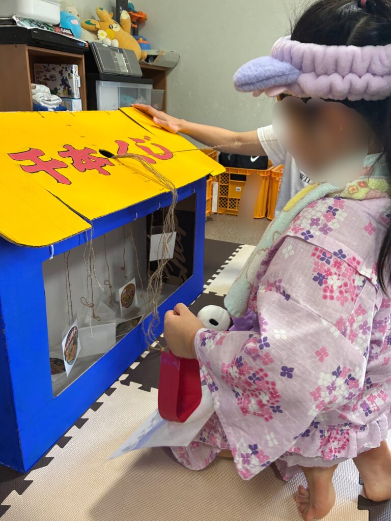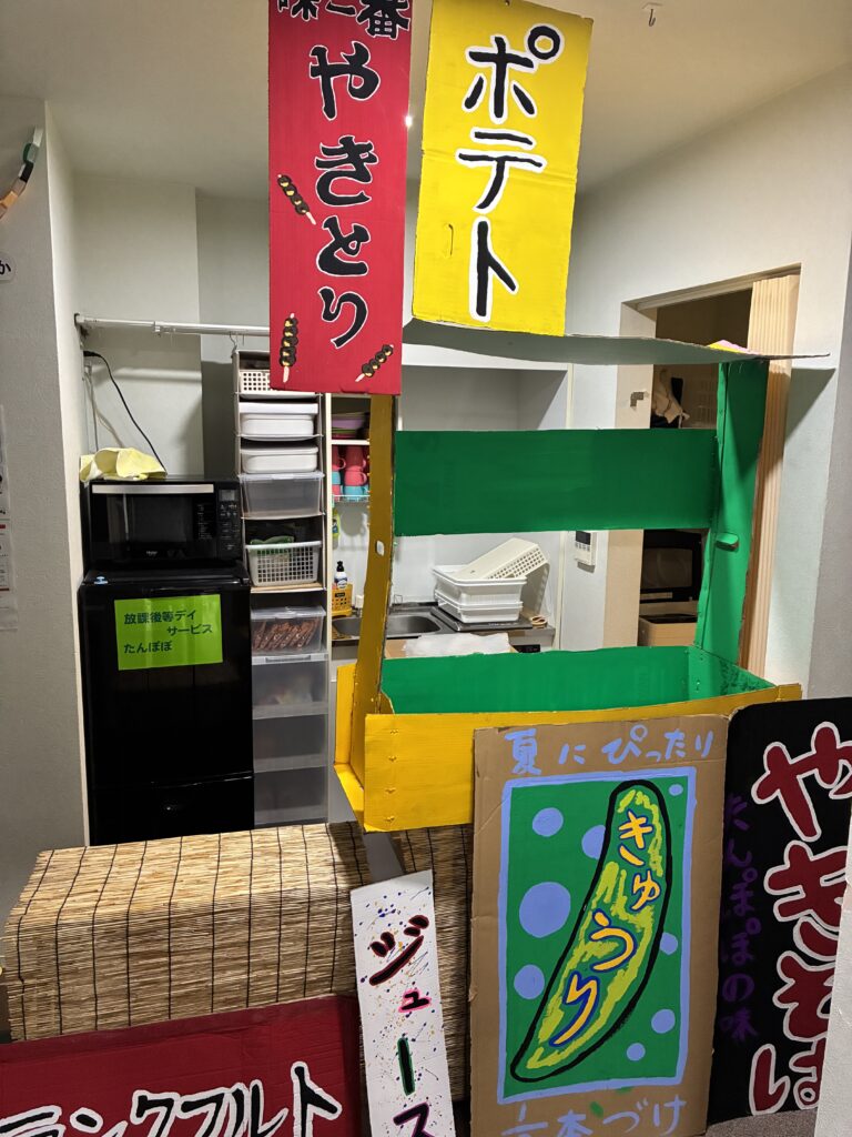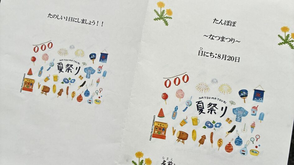 こんにちは。放課後等デイサービスたんぽぽ タバタです。夏休みもいよいよ終盤に差し掛かってきましたね。20日は、楽しみにしていた夏祭りでした。午前中は祭りの雰囲気作りでわっか作りや花紙制作、塗り絵でプレイルームを飾り付けを行いました。12時からスタート!まずは腹ごしらえです!いつもとは違い、みんな並んでそれぞれ好きな物から食べ物を受け取り、自由な場所で食事です。その後はゲーム屋台!千本くじ・掴み取り・すくいゲーム・フリスビーにストラックアウト等、ゲームを回りながら景品ゲットです!そして、有志発表!!この日の為に個人練習・全体練習・会議を重ねてきたメンバー。本当にキラキラしてました!!メンバーの一人はPCを使い、メンバー紹介の動画も制作し、上映!本当、すごい!今回の祭りのしおりも、たんぽぽのPCも使用し、制作してくれました!そんな感じで、利用者・スタッフみんなで楽しい祭りを作り上げ、楽しい時間となりました。そしてこの日をより楽しく・盛り上げてくれた、ボランティアの方々、リトルリトルさん本当にありがとうございました!