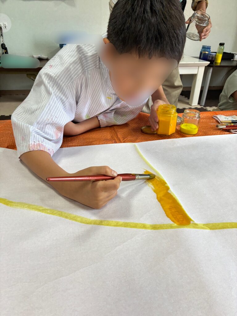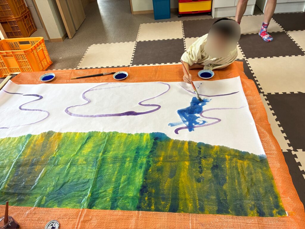 こんにちは。守山市放課後等デイサービスたんぽぽ タバタです。夏休み、終わっちゃいましたね…田畠はいつも夏休みが終わると、気持ちが少し落ちます…子どもの頃からずっとそうです(^^;そんなことはいいとして、9月になり新学期始まりました!3日は壁面作りで、背景の制作でした!みんな、それぞれ与えられたミッションを遂行してくれたおかげで、良い背景がしあがりました。次回で全貌が明らかに?!こうご期待!