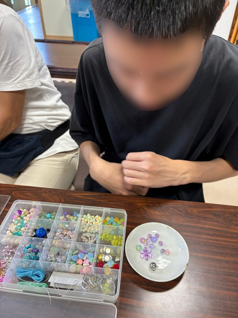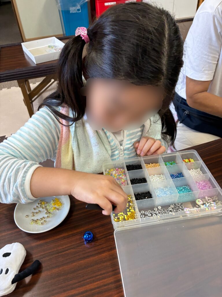 こんにちは(^^) 守山市放課後等デイサービス たんぽぽ タバタです。急に秋めいてきましたね。そりゃもう10月ですからね!10月は野洲養護学校の小学6年生・中学3年生・高校3年生は修学旅行に、今まさに行ってはります!楽しんでるんだろうなぁ。お土産話が楽しみです!! 微細運動の個別活動でビーズ通しが、今ブームです!なかなか難しい…というお友だちも、集中力を切らさず、頑張って作ってくれてます!